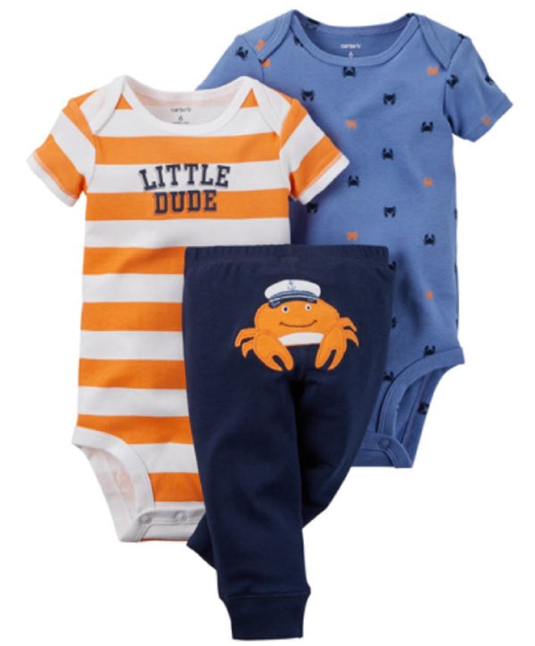 PRODUCT FEATURES:3-piece set includes: 2 bodysuits & 1 pair of pants(sleeve length varies upon style, please see pictures)Long-sleeved bodysuit: envelope neck, inseam snapsShort-sleeved bodysuit: envelope neck, inseam snapsFABRIC & CARE:CottonMachine washImported