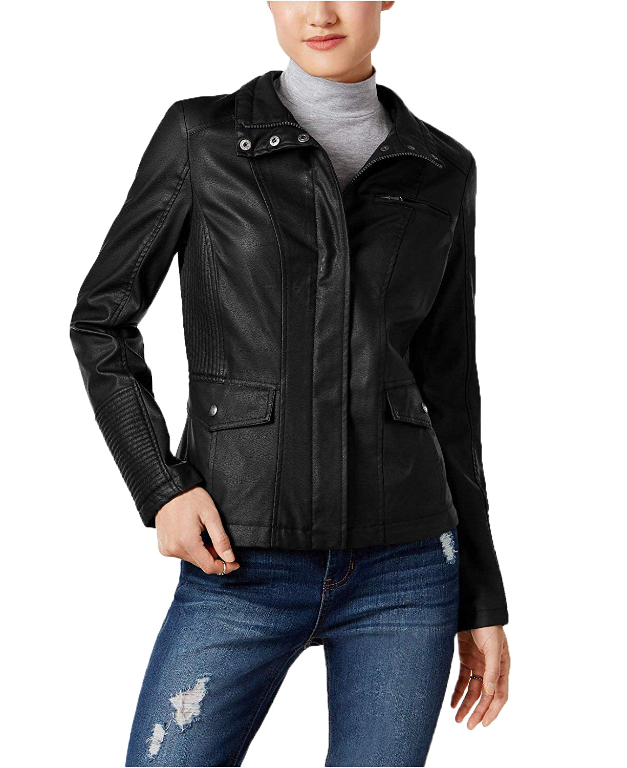 Zipping and snapping at the front like your favorite anorak styles, faux-leather jacket adds a polished finish to every look.